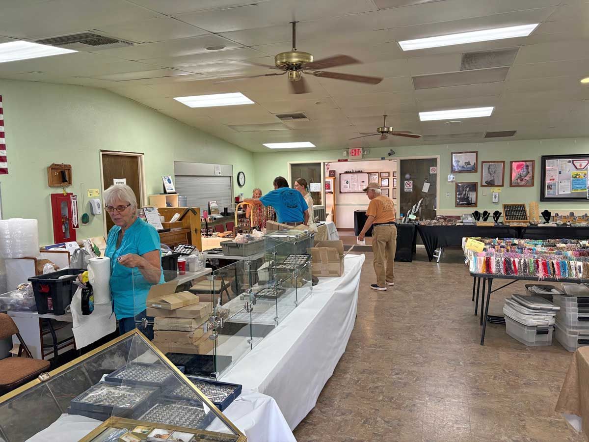 Display cases of fossils and meteorites along with a display case of the work done at our workshop, and another of the item from the Wednesday classes held at the Art Center were enjoyed by the visitors. Slabs and larger specimens of rocks were bought by many guests of the gem show, who took home wonderful items for their next project or for display. It was a great time of fun for all the members who participated also.
