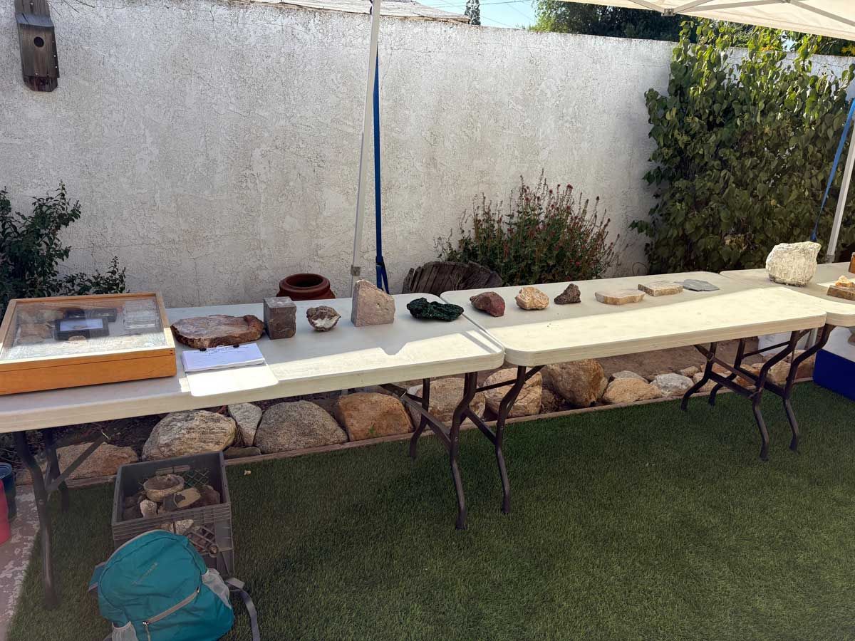 Our spinning wheel was enjoyed by young and old and raised money for the club. On the patio out back of the senior center there were hundreds of slabs of rocks cut by club members at our workshop which were for sale.