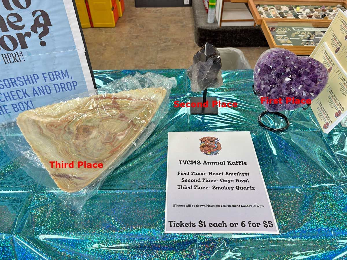 The Open House gave us our first opportunity to purchase raffle tickets for our Annual TVGMS Raffle. This year the prizes are a gorgeous, deep-purple amethyst heart, a huge onyx bowl, and a mounted smoky quartz crystal.