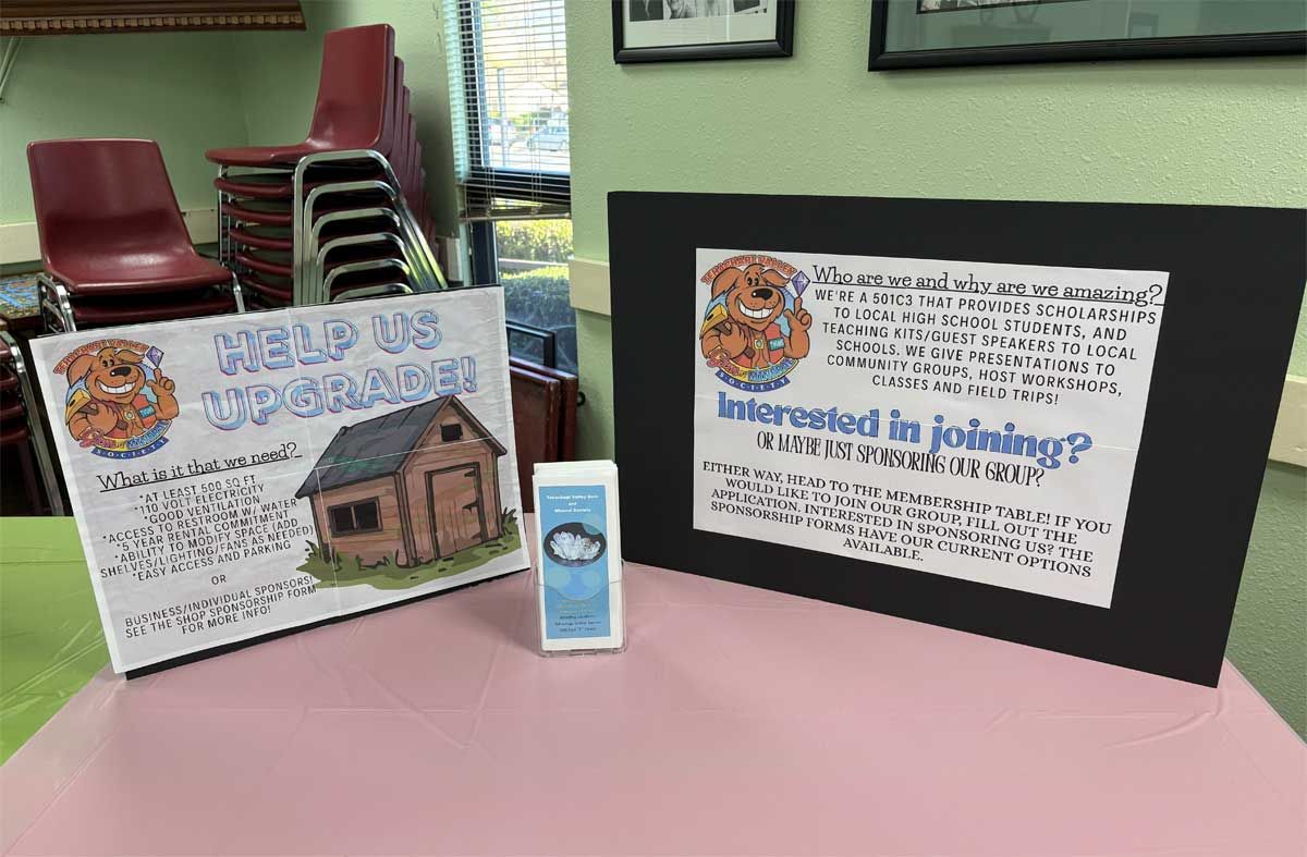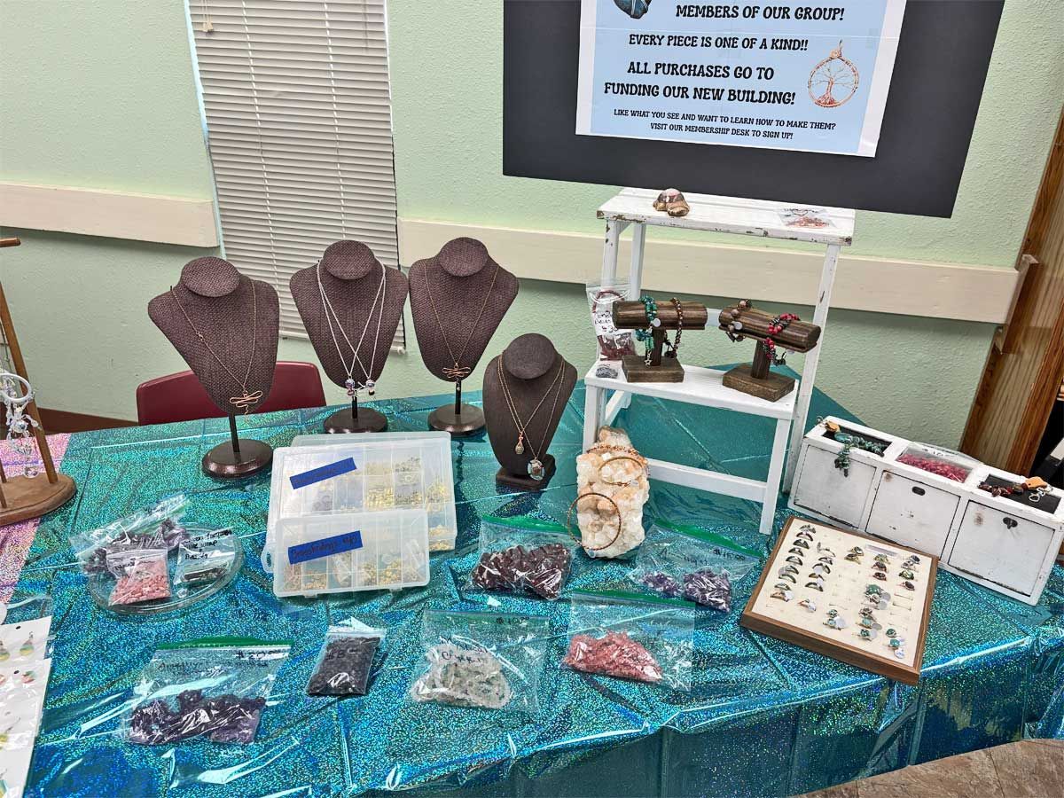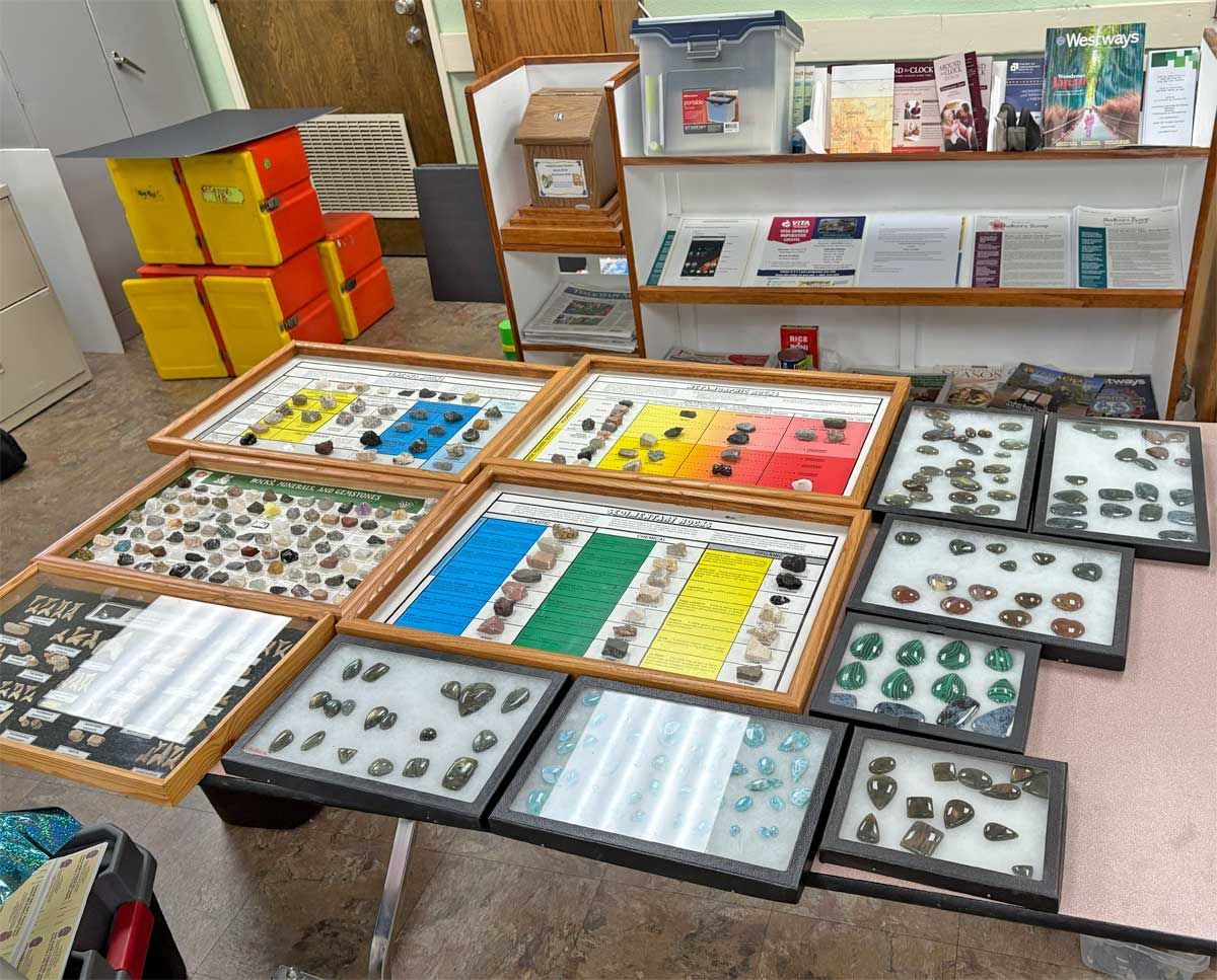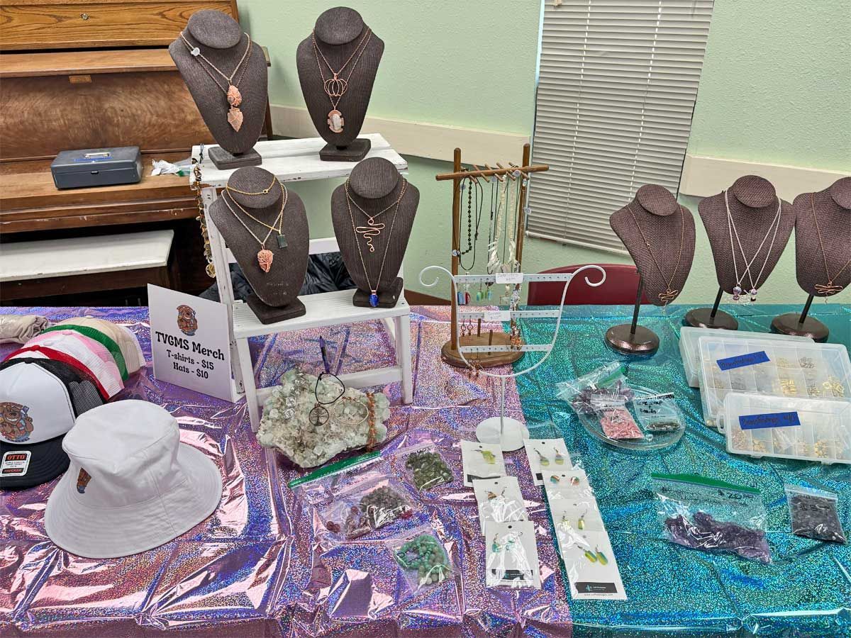 A display table was dedicated to finding potential sponsorships in our ongoing search for a larger facility to house our lapidary and jewelry workshop. We have been running out of space for a while but there is still opportunity for more members to use the equipment. Members interested in cutting rocks and creating gemstones such as cabochons or making projects such as polished slabs or almost anything made of rock gather on Mondays from 10-12 and on Thursdays from 12-2 pm. There are members who are happy to offer any assistance needed for those who are just learning to work with rocks and minerals. Instruction in finished jewelry techniques such as silversmithing and wire wrapping is also available. Attendance at the workshop does require membership in the TVGMS. Samples of the type of work done at the workshop was on display around the Open House.