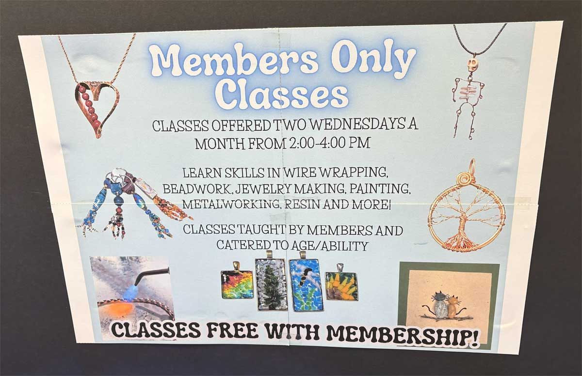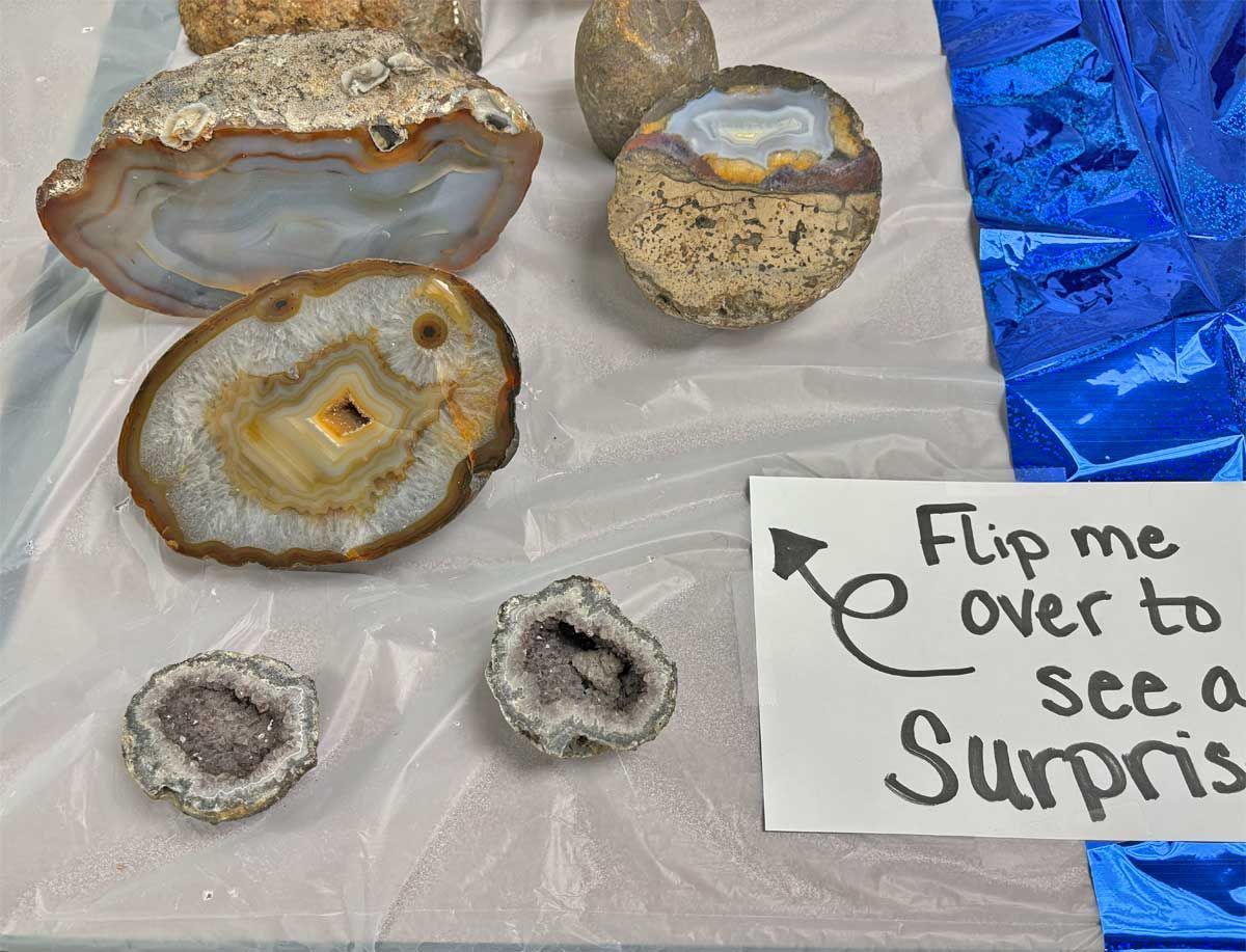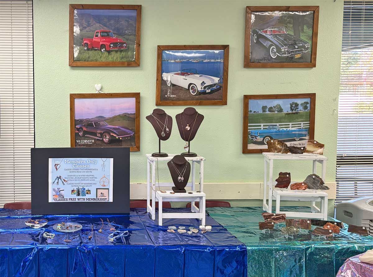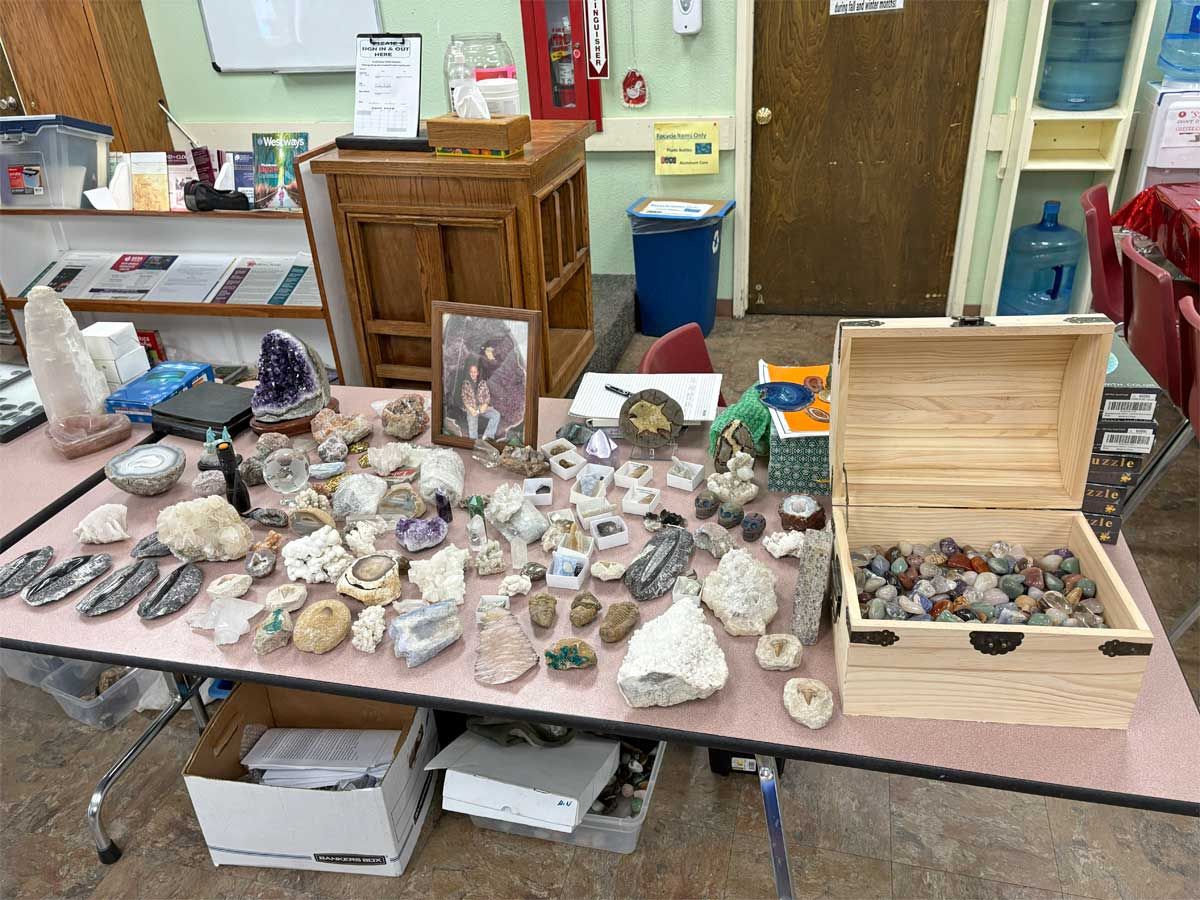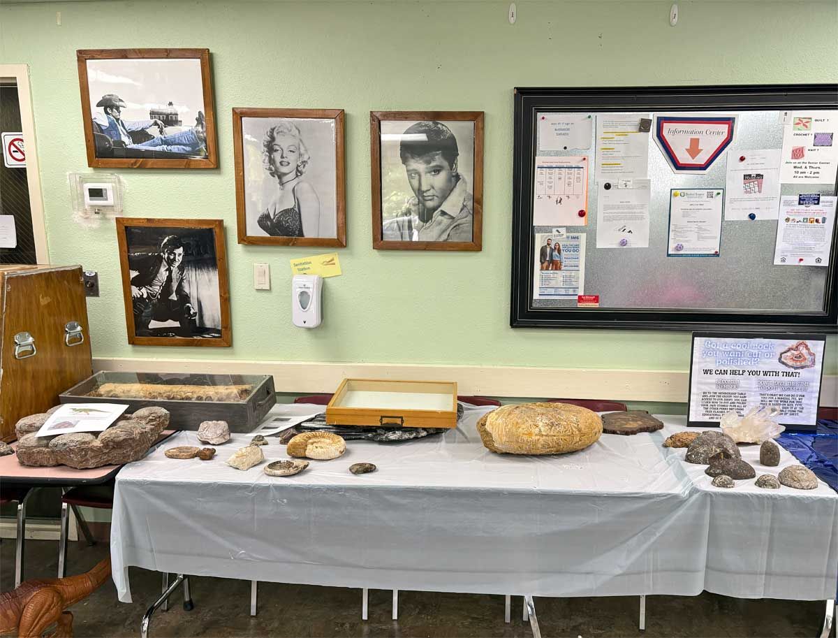 A display table was dedicated to finding potential sponsorships in our ongoing search for a larger facility to house our lapidary and jewelry workshop. We have been running out of space for a while but there is still opportunity for more members to use the equipment. Members interested in cutting rocks and creating gemstones such as cabochons or making projects such as polished slabs or almost anything made of rock gather on Mondays from 10-12 and on Thursdays from 12-2 pm. There are members who are happy to offer any assistance needed for those who are just learning to work with rocks and minerals. Instruction in finished jewelry techniques such as silversmithing and wire wrapping is also available. Attendance at the workshop does require membership in the TVGMS. Samples of the type of work done at the workshop was on display around the Open House.