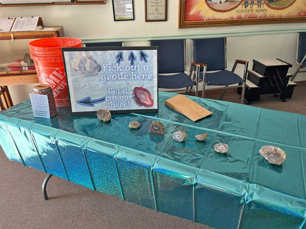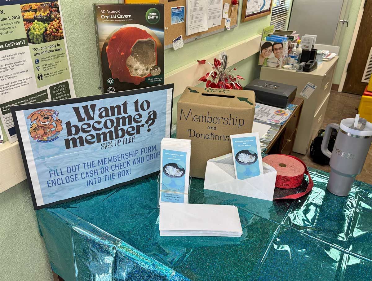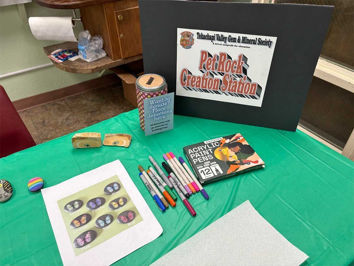 The Open House was an opportunity to introduce the community to our club and the things we do. We are celebrating our 40th year and are proud of our contributions to the Tehachapi community. Each year we give several scholarships to high school students and provide educational resources to area schools as well as send out knowledgeable members to give presentations to schoolchildren on geology and Earth Science. As a group we are interested in rocks and minerals and go on a wide variety of rockhounding field trips and museum trips. Our monthly meetings often feature speakers on topics dealing with Earth Science. We also have a workshop of lapidary equipment for members to learn to cut and polish rocks, and classes to learn various jewelry techniques. All field trips and classes are free to members making it the best deal in town! The Open House was a collection of visual and hands-on displays to introduce the community to TVGMS.