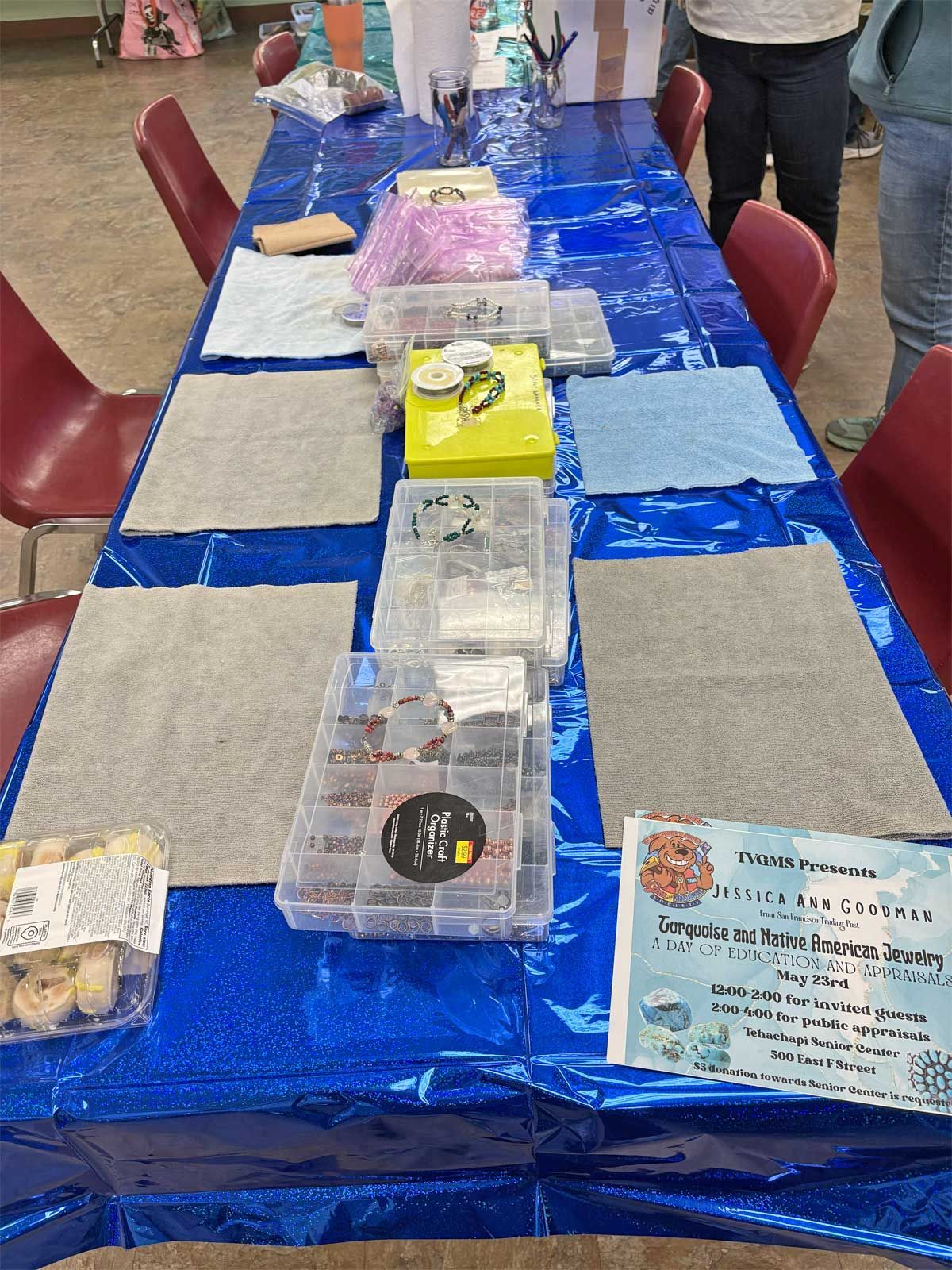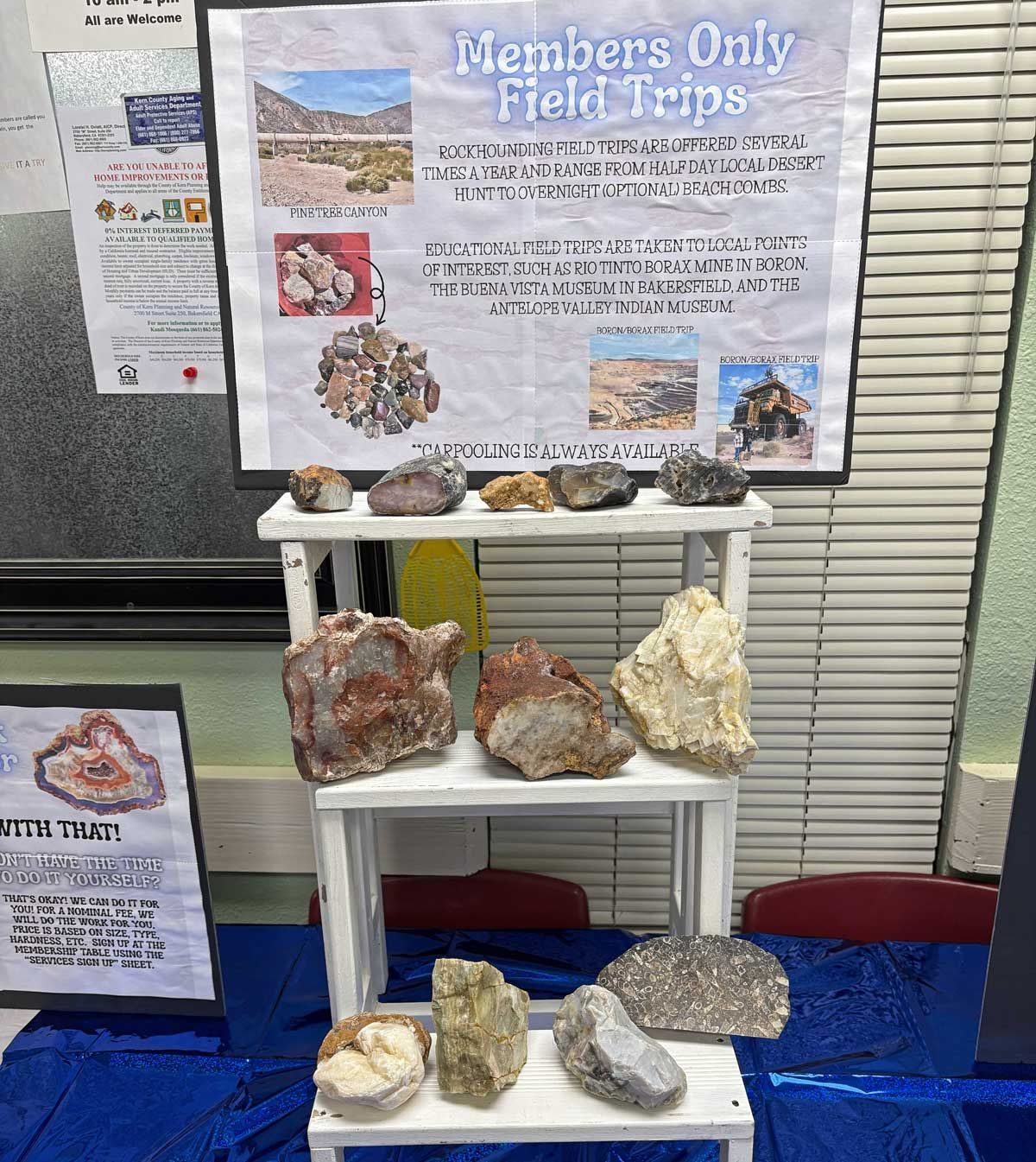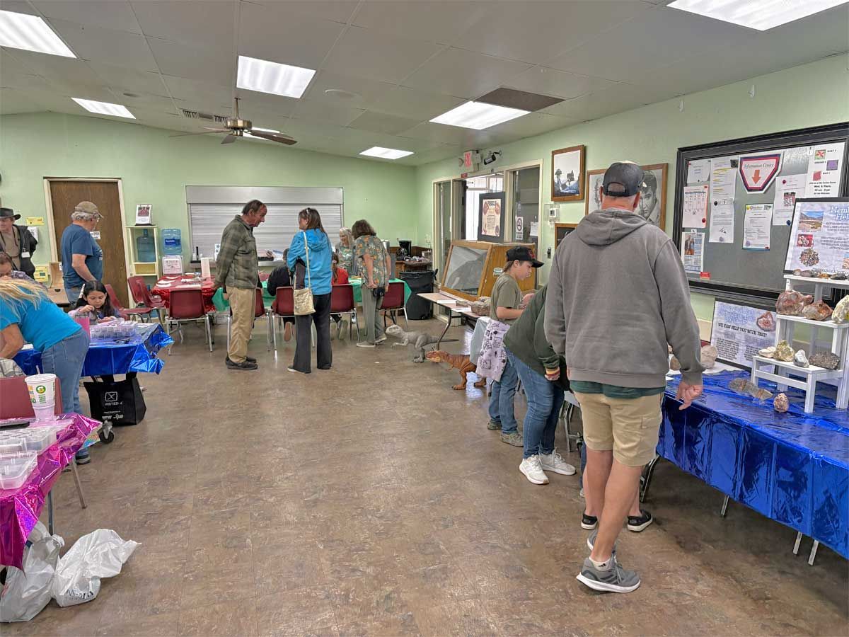 The Open House was an opportunity to introduce the community to our club and the things we do. We are celebrating our 40th year and are proud of our contributions to the Tehachapi community. Each year we give several scholarships to high school students and provide educational resources to area schools as well as send out knowledgeable members to give presentations to schoolchildren on geology and Earth Science. As a group we are interested in rocks and minerals and go on a wide variety of rockhounding field trips and museum trips. Our monthly meetings often feature speakers on topics dealing with Earth Science. We also have a workshop of lapidary equipment for members to learn to cut and polish rocks, and classes to learn various jewelry techniques. All field trips and classes are free to members making it the best deal in town! The Open House was a collection of visual and hands-on displays to introduce the community to TVGMS.