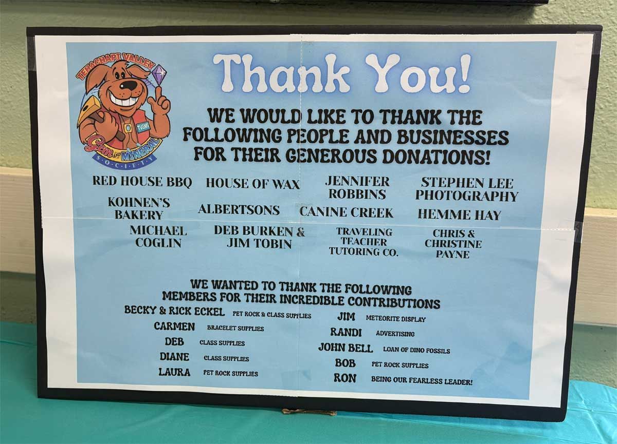 Many businesses in our town generously gave to support our raffle and we’d like to thank them. Canine Creek, Kohnen’s Bakery, Red House BBQ, House of Wax, Albertson’s, Traveling Teacher Tutoring Co., Hemme Hay, Tehachapi Art Center, Stephen Lee Photography. Many individuals also donated items: Michael Coghlin, Peggy and Mike Finley, Jennifer Robins, Nancy Waldron, Chris and Christine Payne, Carmen Irving, Jim Tobin, Deb Burken, Diane Farnsworth, Randi Elmore, Rick and Becky Eckel, and all the members who donated their time to make this event come together.